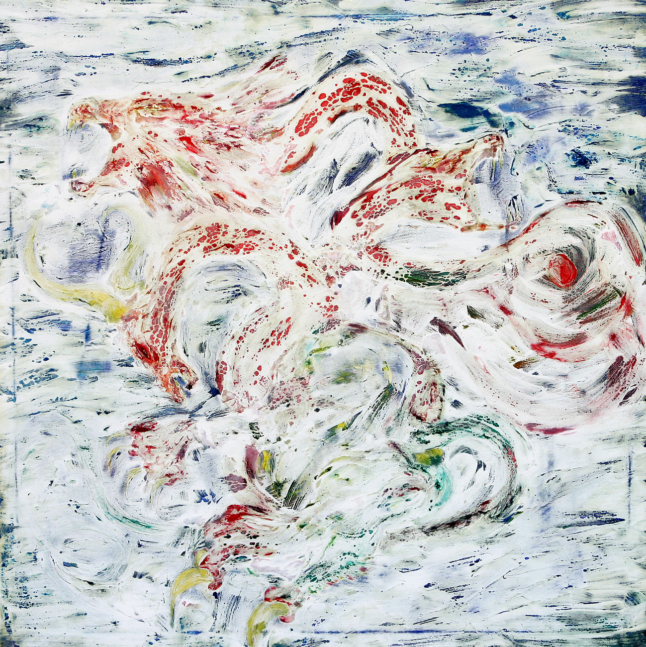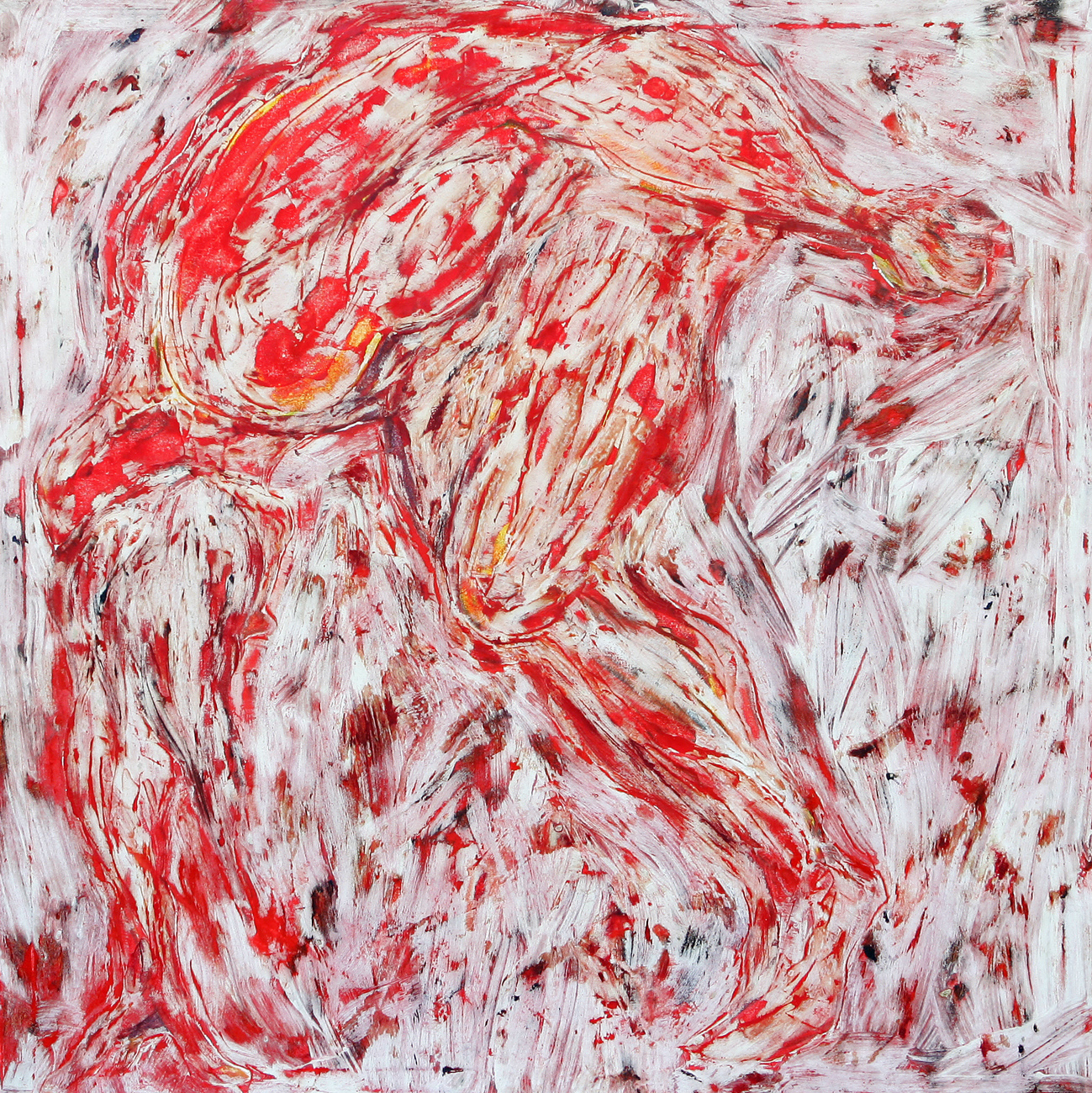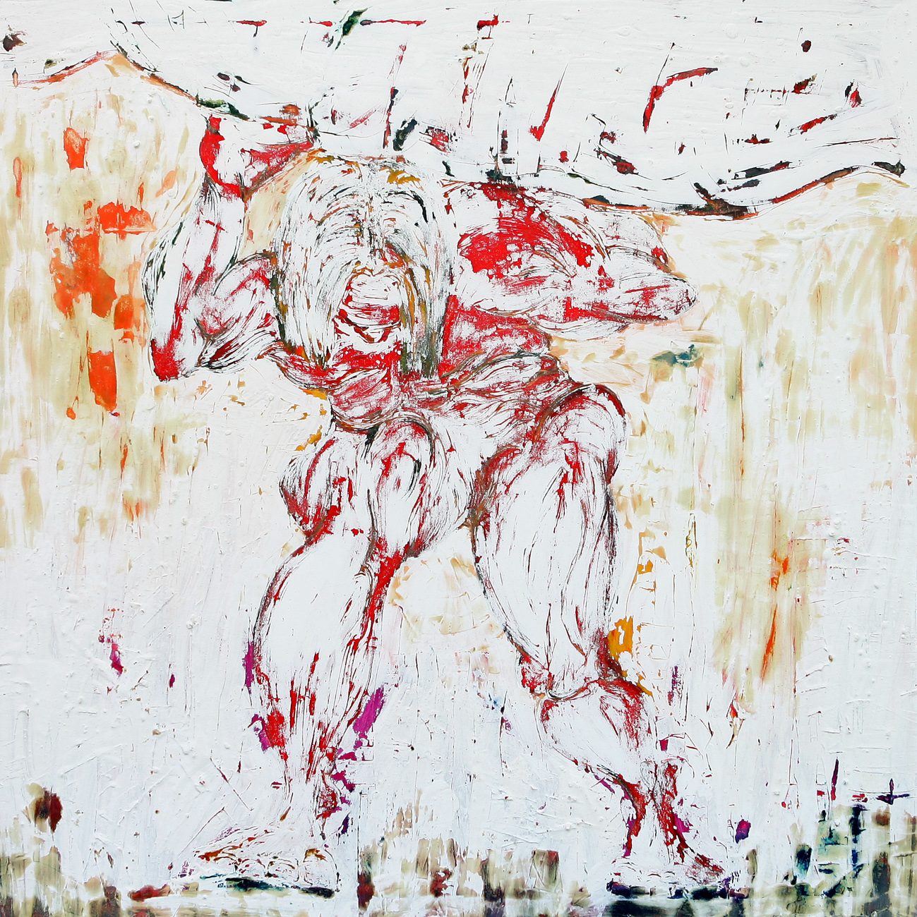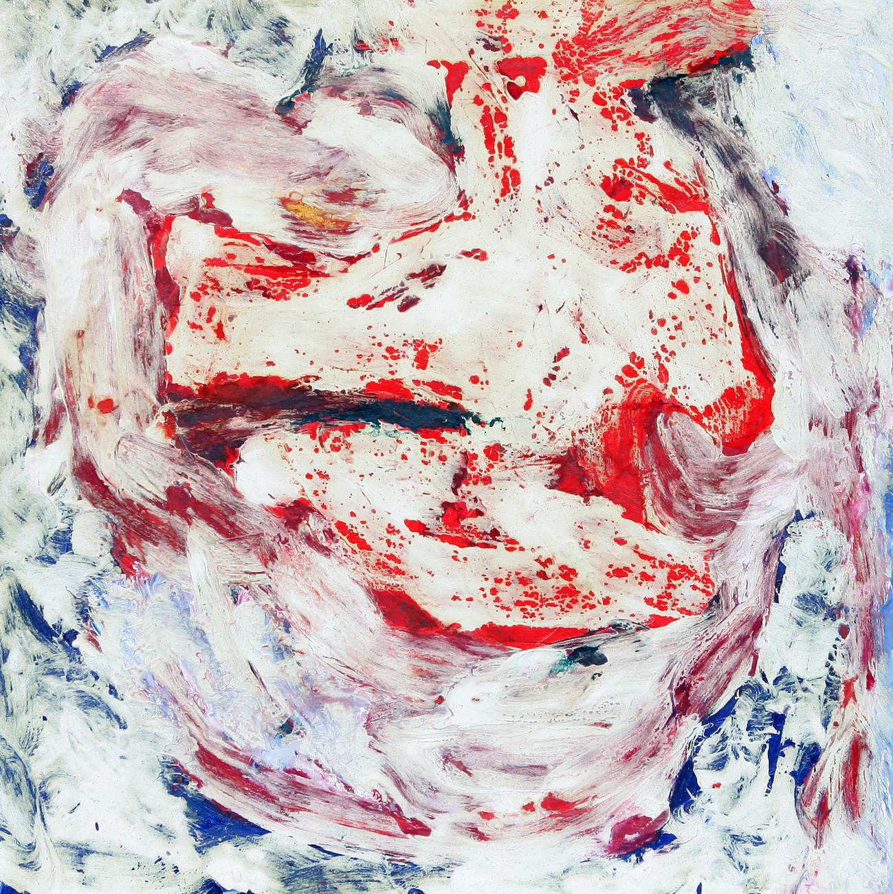 Die Arbeiten sind alle auf der Basis der Ölmalerei entstanden. Die Themen und Motive sind zunächst mit Ölfarbe (Pinsel und Spachtel) auf der Leinwand gestaltet und in diesem Stadium des Arbeitsprozesses „fertig". Jetzt müssen die Farben etwas antrocknen (in der Regel zwei Tage, obwohl die unterschiedlichen Farben auch unterschiedlich schnell bzw. langsam antrocknen – z.B. trocknet Ultramarinblau schneller als Krapplackrot), bevor der nächste Arbeitsabschnitt beginnen kann. Über diese Ergebnisse ziehe ich dann mit dem Pinsel und dem Spachtel breiig angerührten Füllspachtel der in kürzester Zeit antrocknet (ein paar Stunden). Das ursprüngliche Werk ist jetzt unter einer durchgängig weißen, reliefartig strukturierten Fläche verborgen und befindet sich im zweiten Stadium.