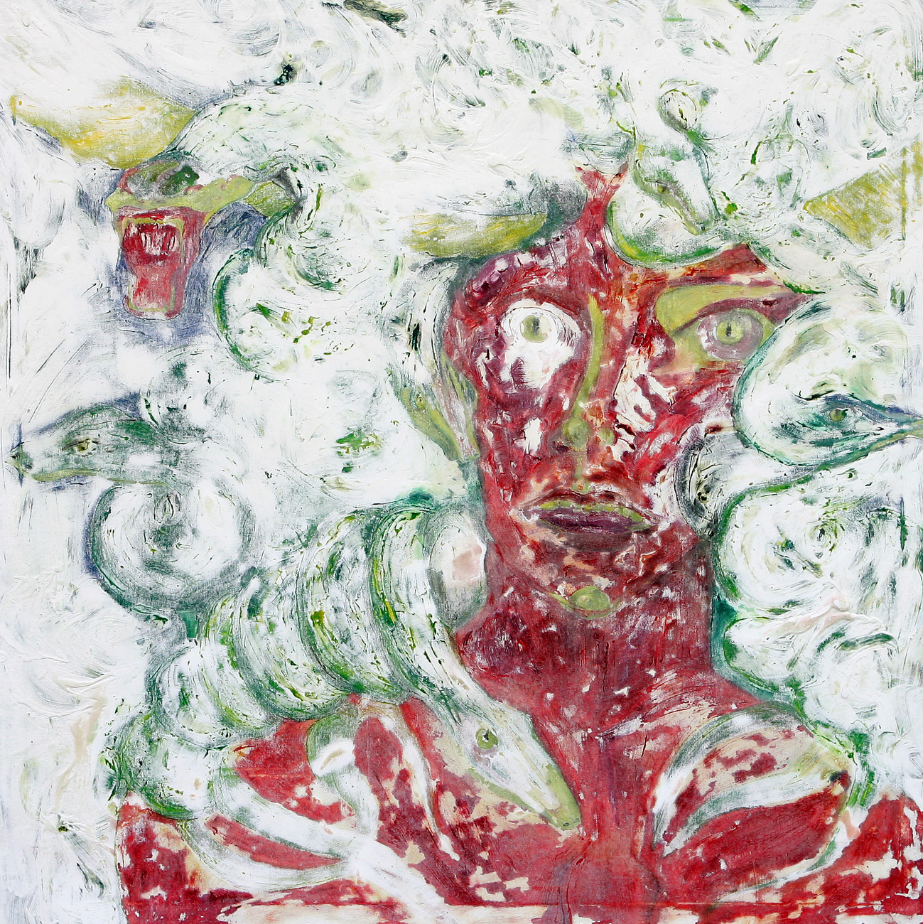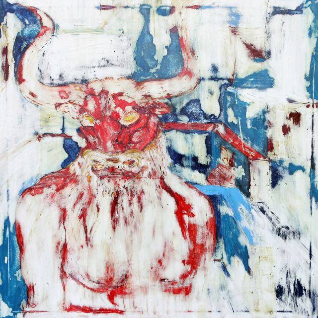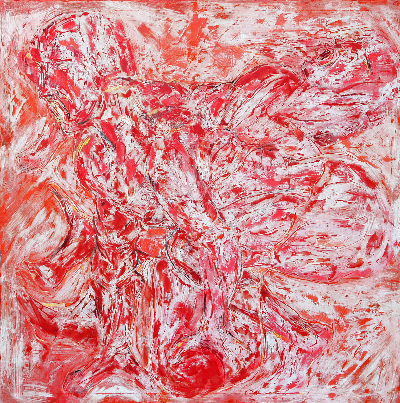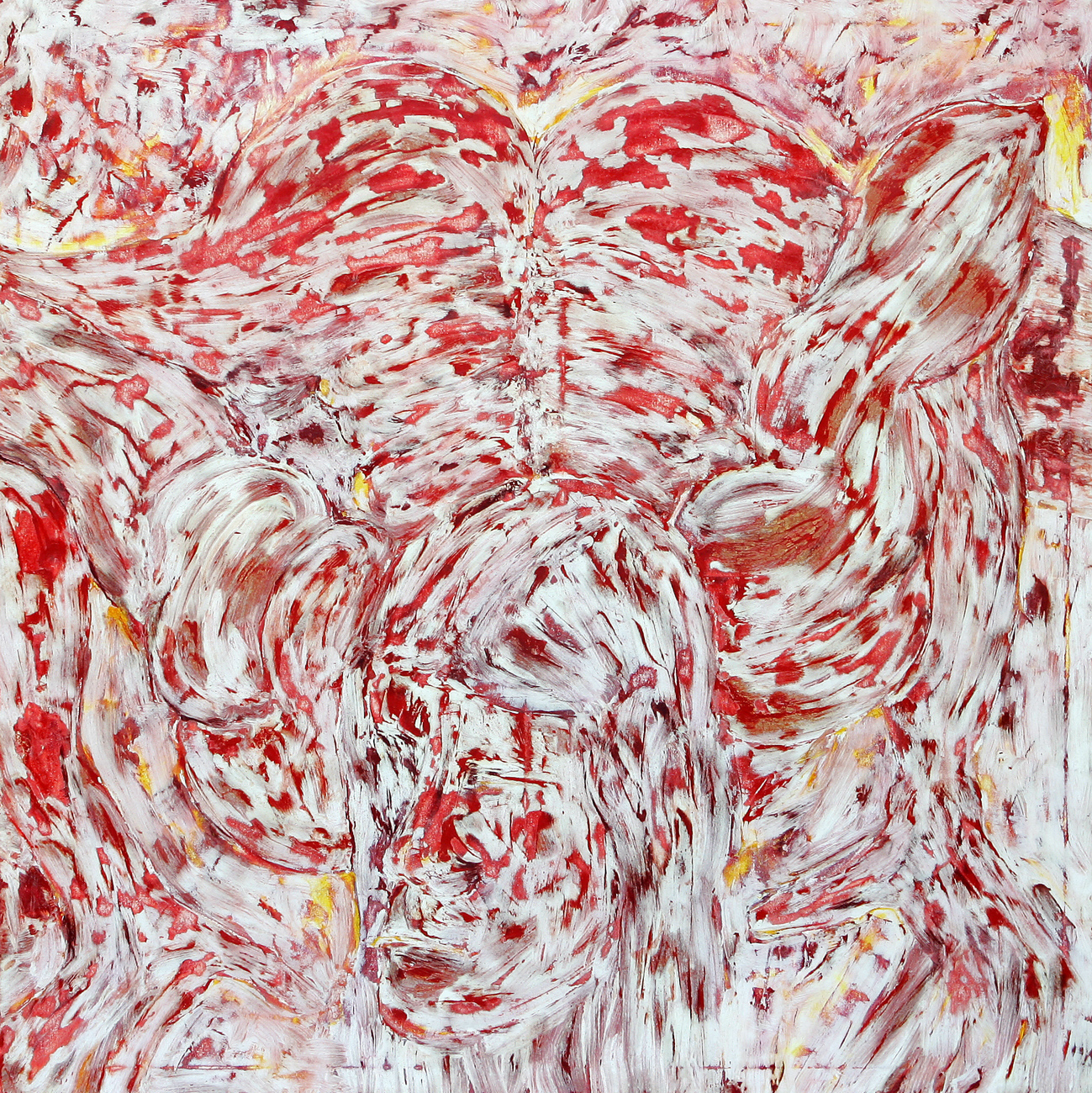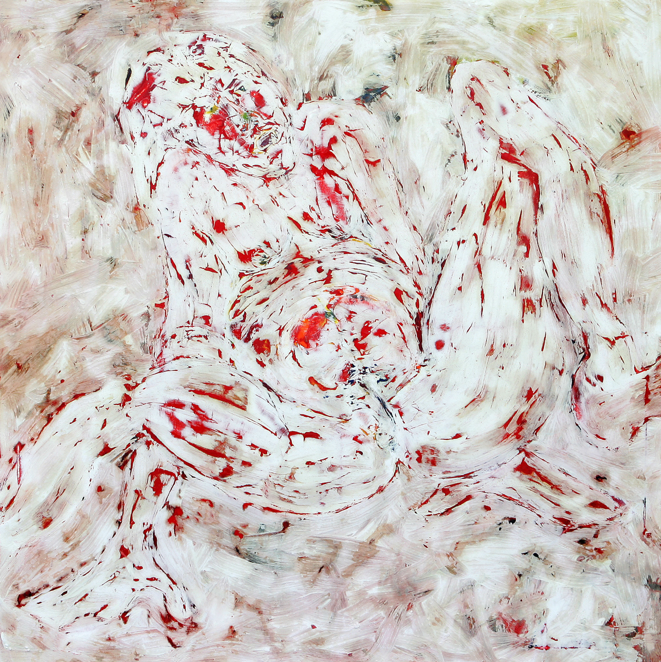 Die Arbeiten sind alle auf der Basis der Ölmalerei entstanden. Die Themen und Motive sind zunächst mit Ölfarbe (Pinsel und Spachtel) auf der Leinwand gestaltet und in diesem Stadium des Arbeitsprozesses „fertig". Jetzt müssen die Farben etwas antrocknen (in der Regel zwei Tage, obwohl die unterschiedlichen Farben auch unterschiedlich schnell bzw. langsam antrocknen – z.B. trocknet Ultramarinblau schneller als Krapplackrot), bevor der nächste Arbeitsabschnitt beginnen kann. Über diese Ergebnisse ziehe ich dann mit dem Pinsel und dem Spachtel breiig angerührten Füllspachtel der in kürzester Zeit antrocknet (ein paar Stunden). Das ursprüngliche Werk ist jetzt unter einer durchgängig weißen, reliefartig strukturierten Fläche verborgen und befindet sich im zweiten Stadium.